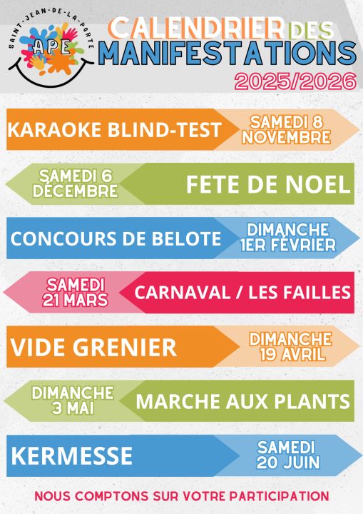 Vous trouverez ci-joint le calendrier des manifestations organisées par l'APE (association des parents d'élèves) ainsi que le flyer pour le karaoké. Ces animations sont organisées afin de récolter de l'argent pour les sorties scolaires de vos enfants. Je vous rappelle que pour chaque manifestation, l'association a besoin de parents bénévoles. N'hésitez pas à vous faire connaitre :)